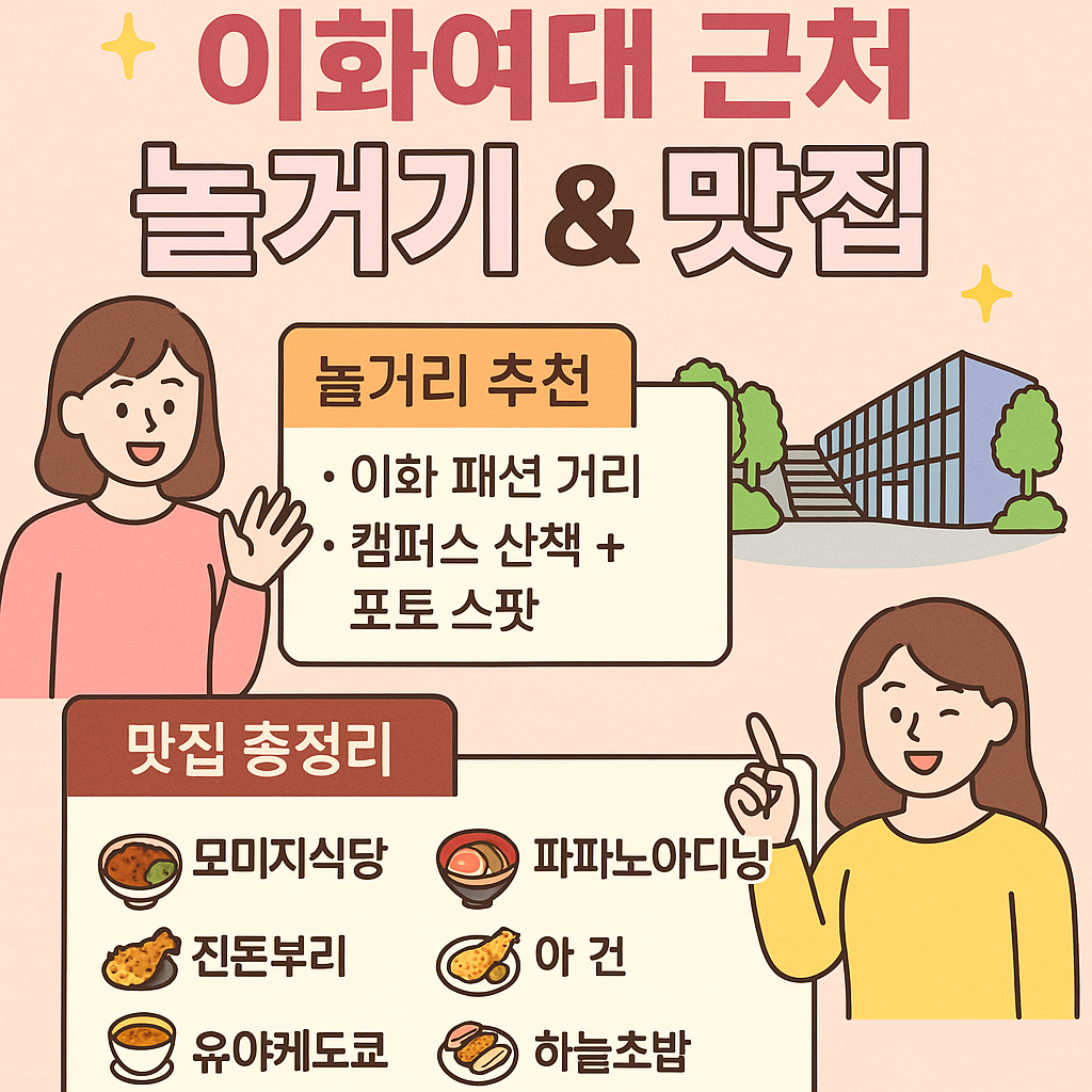 이화여자대학교는 단순한 대학 캠퍼스를 넘어, 서울에서 감성적인 하루를 보낼 수 있는 명소로도 손꼽힌다. 특히 이대역을 중심으로 펼쳐지는 패션 거리, 개성 있는 카페 골목, 그리고 수준급의 맛집들은 많은 사람들의 발걸음을 이끌고 있다. 이번 포스팅에서는 이대 근처에서 하루를 보내기 좋은 놀거리와 맛집 코스를 소개하려 한다. 친구와 데이트를 하거나, 혼자만의 감성 산책을 하기에도 완벽한 장소다.